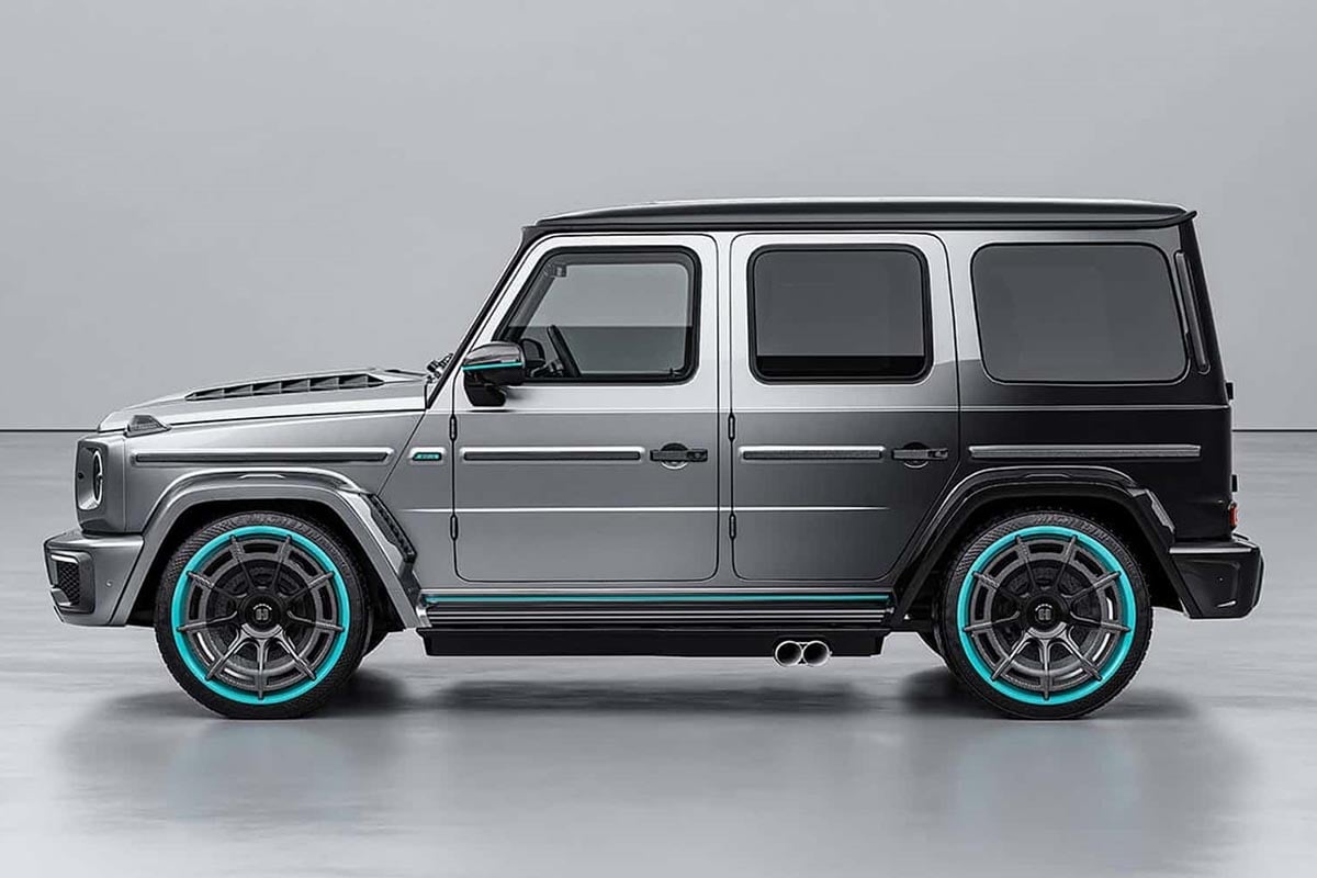 Pour commencer, nous trouvons un kit de carrosserie en fibre de carbone qui donne un caractère supplémentaire à l’ensemble, ajoutant une peinture bicolore avec un dégradé d’argent et de noir, des détails en vert Petronas et d’énormes jantes de 23″ équipées de pneus haute performance.